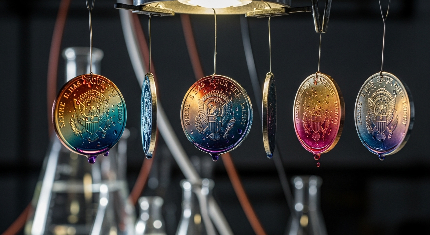 - Electroplating: The coins are dipped in tanks of precious metal ions (Gold, Silver, or Nickel).